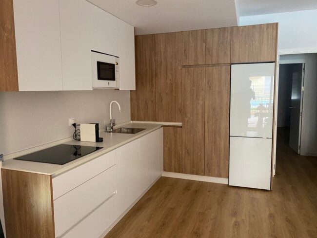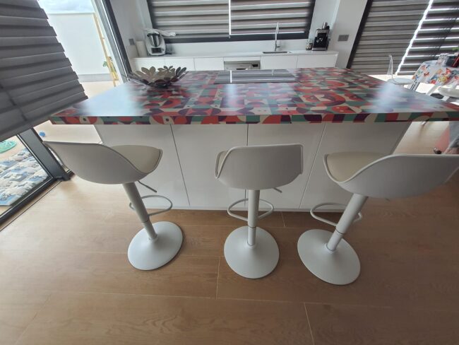 Detalle de isla. Muebles DM blanco alto brillo y encimera porcelánico Coverlam Muebles DM blanco alto brillo y encimera porcelánico Coverlam Detalle de encimera porcelánico Coverlam