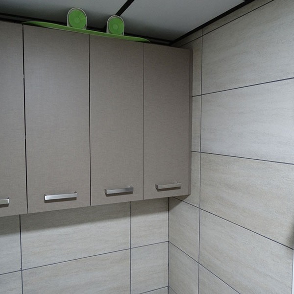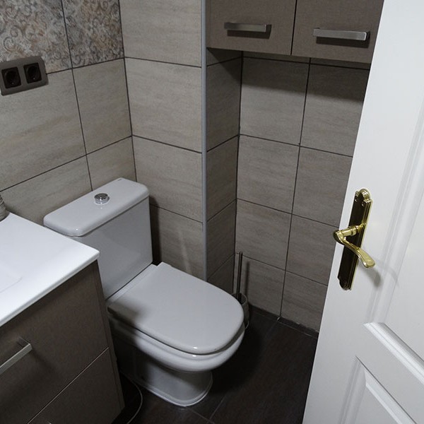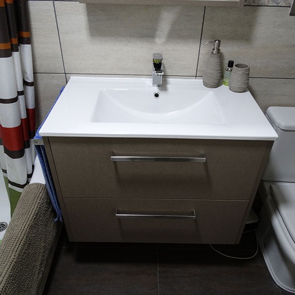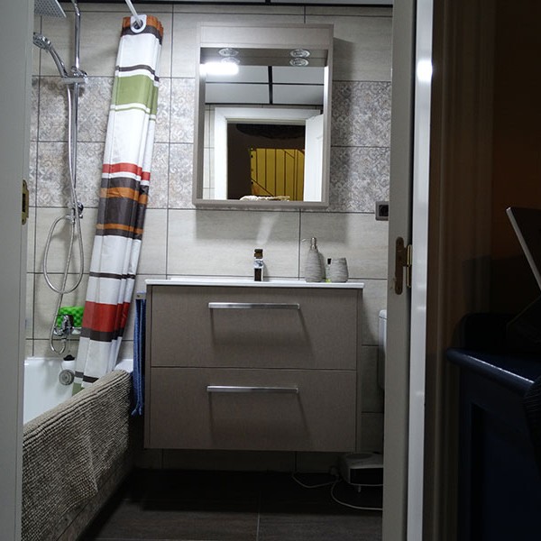 Baño con mucho estilo compuesto por un bajo suspendido con dos caceroleros, marco espejo con dos focos integrados y dos muebles altos con dos puertas, aprovechando al máximo todos los espacios sin agobiarlo.