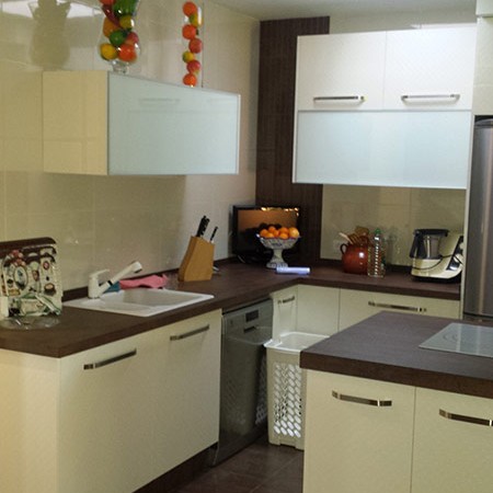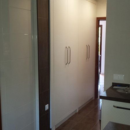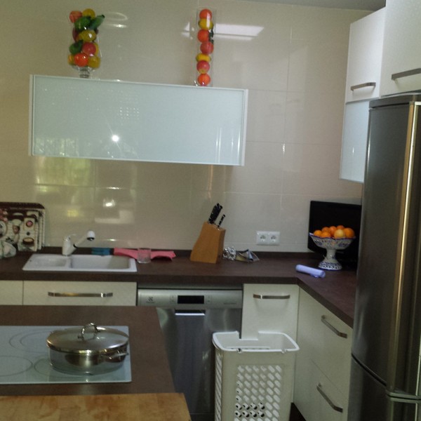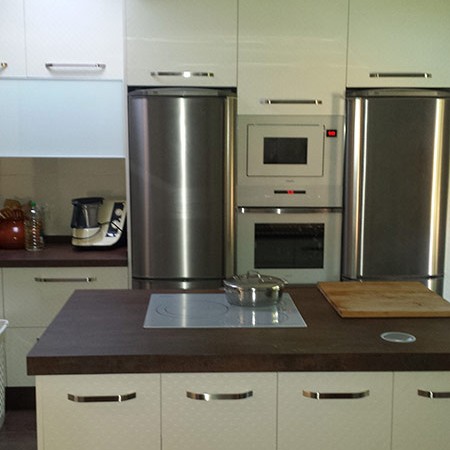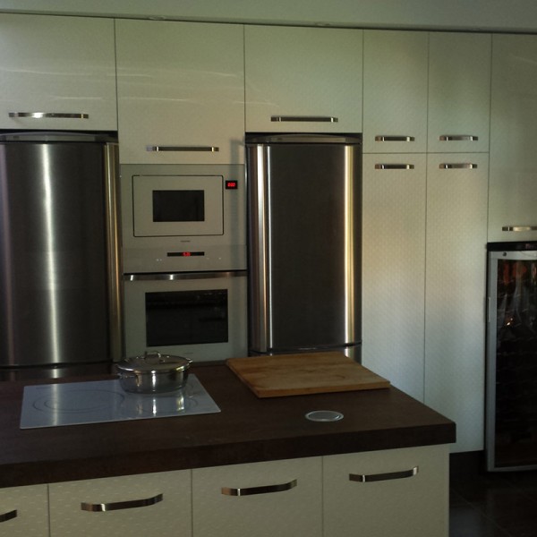 Composición de los muebles de cocina altos: 1 de 45×120 y 45x110cm abatible con vitrina en aluminio y cristal lacado blanco, 2 sobre frigoríficos de 51×60 con 1 puerta mas 1 columna de 220×60 con 2 caceroleros + horno + micro + puerta, 1 de 220×70 para lavadora + secadora integrable + puerta, 1 de 107x51cm con una puerta.