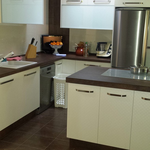 Accesorios: Campana embutida en techo, enchufes y cubo de basura empotrados en encimera, cubiertero de 120cm y fondo de aluminio bajo fregadero.