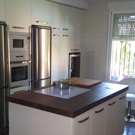 Esta magnifica cocina, finaliza con una bonita isla compuesta de muebles bajos de 70x75cm + 70x120cm + 70x30cm.